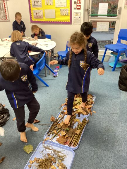 Last week, the children had an exciting science lesson at Woodland School, where they explored the sense of touch. They collected leaves, branches, and other natural materials, which they used to create a barefoot walk. Walking over their collection allowed them to experience a variety of textures underfoot, sparking curiosity and lots of laughter! The hands-on (or feet-on!) activity brought their study of the senses to life and was thoroughly enjoyed by all.