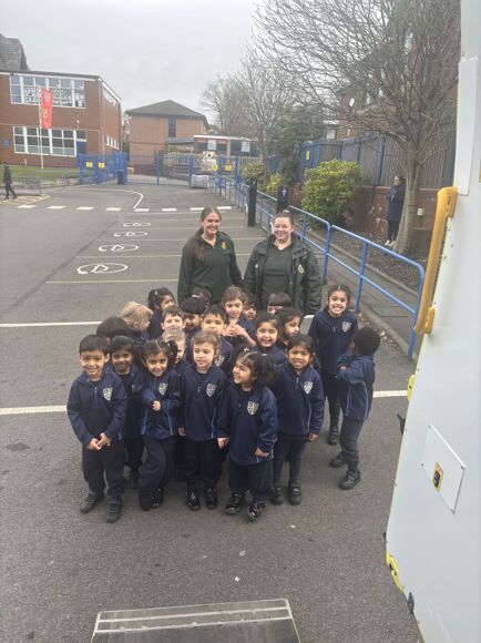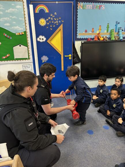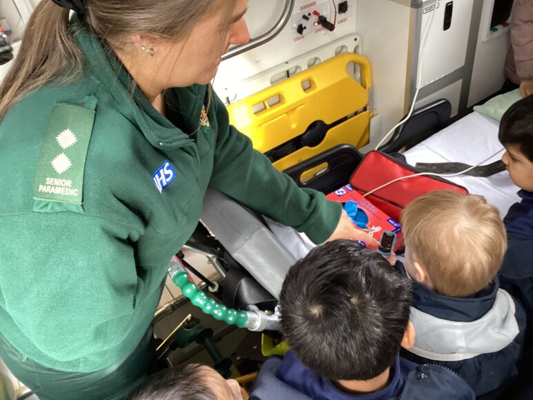 We kicked things off with a walk around school, introducing the children to the nurse, office staff, kitchen team, site team, and teachers across the school. After that, we dove into learning about the emergency services. The paramedics were particularly impressed with the children’s thoughtful questions, and everyone had a great time exploring the bandage box! The police visit was another highlight, complete with sirens, hats to try on, and even handcuffs. The children were full of questions, eager to learn how fast the police get to drive and even trying out the handcuffs on their teachers!