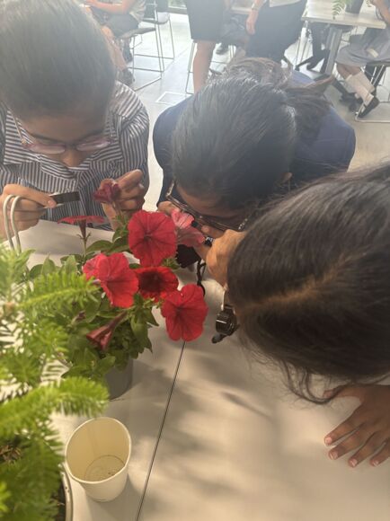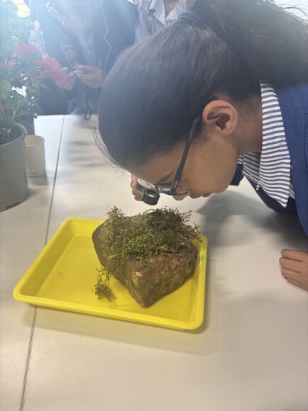 The session began with a fun and informative activity where one pupil dressed as a plant while the group identified its parts and their functions, learning how pollination leads to the production of new plants. Pupils explored how plants can reproduce in different ways – from seeds and spores, to cuttings – using magnifying glasses and handheld microscopes to examine examples up close.