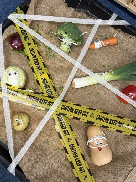 One of the most memorable moments was discovering that the EVIL PEA had escaped into our classroom! Chaos followed, with trapped vegetables, mysterious messes, and lots of puzzled faces. But our Reception superheroes were quick to respond. They investigated the scene, rescued the poor veggies, and got straight to work tracking down the pesky pea.